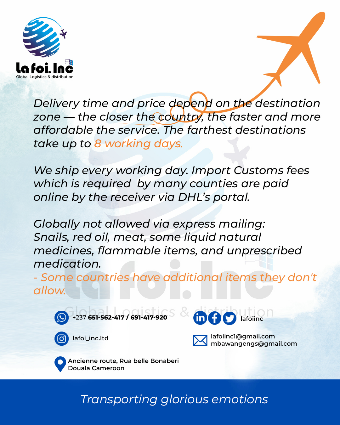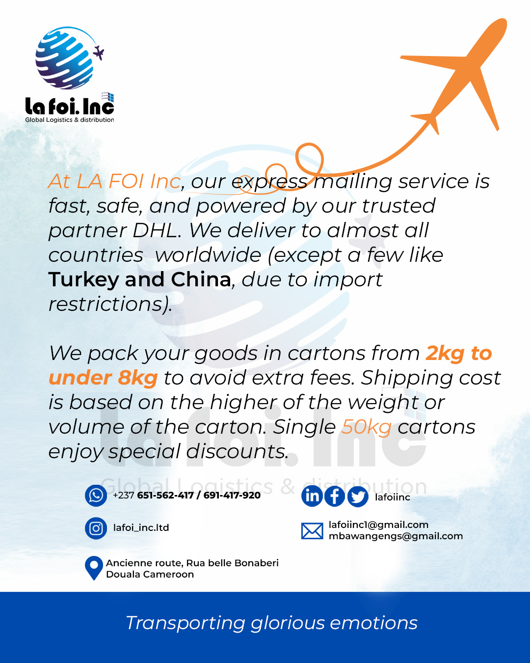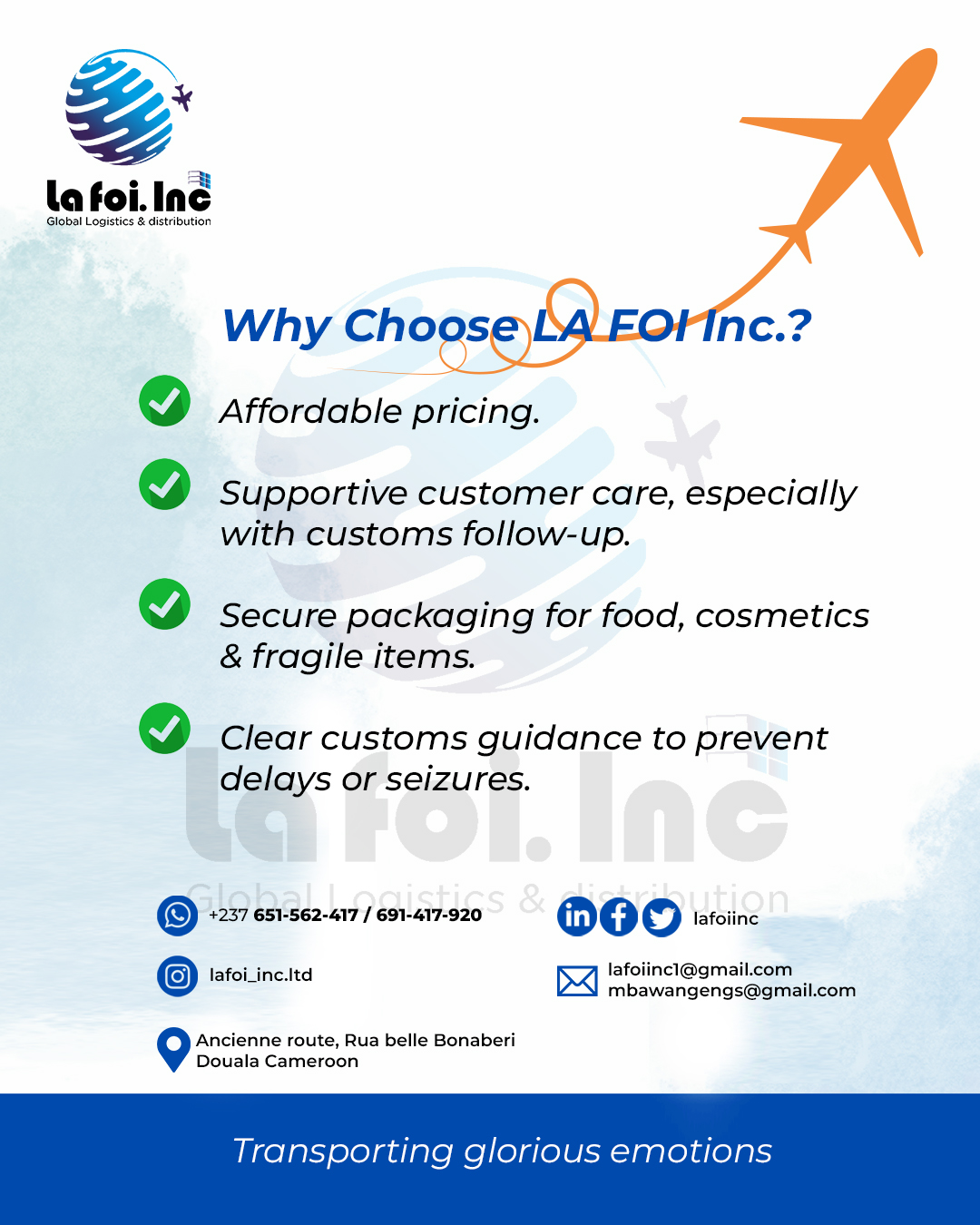 LA FOI Inc., headquartered in Douala, Cameroon, is a leading global logistics and distribution company with a network of facilitating partners. We we offer a variety of services such as bulk freight and clearing services, also we handle the purchase of goods on Amazon, eBay and Source from China to import to Cameroon, while also handling the import, clearing, and delivery process from the U.S to Cameroon. Our services extend to See all services…